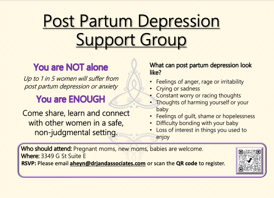 If you are suffering from post-partum depression, then you’re invited to join our emotional support group. Please come, share, learn, and connect with other women in a safe, non-judgmental setting.